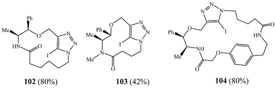 The same team reported a new macrocyclisation strategy to synthesise 5-iodo-1,2,3-triazole-containing macrocycles 102–104 (Figure 26) [46]. The macrocycles were generated using a simple and efficient copper-catalysed cycloaddition in flow and under environmentally friendly conditions. This methodology also permits the facile, regioselective synthesis of 1,4,5 trisubstituted-1,2,3-triazole-containing macrocycles using palladium-catalysed cross-coupling reactions.