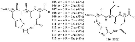Sessler et al. [47] also utilised the copper(I)-catalysed cycloaddition to synthesise cell-permeable 1,2,3 triazole-based macrocycles 105–116 with peptidyl backbone (Figure 27). The structure of these macrocycles was confirmed by NMR spectroscopy and high-resolution mass spectrometry (HRMS). They found that the obtained macrocycles could act as inhibitors of norovirus 3CL protease.