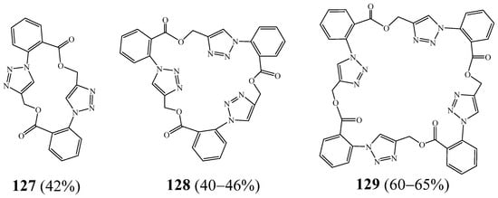 In their paper published in 2009, Sandra Binauld et al. [49] reported a subsequent CuAAC intramolecular cyclisation, performed under pseudo-high-dilution conditions, providing a series of novel macrocycles 120–123 with different ring sizes (Figure 29). This pathway was shown to be a facile, high-yielding process and can be accurately controlled.