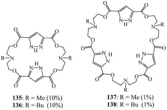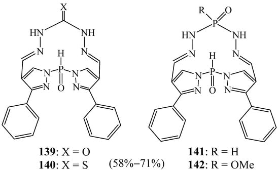 Recently, Dahmani et al. [75] reported two new organotin (IV) bipyrazole-dicarboxylate macrocyclic complexes 156 and 157 (Figure 44) by condensing of one equivalent of the bipyrazole-dicarboxylic acids 1,1′-(propane-1,3-diyl)bis(5-methyl-1H-pyrazole-3-carboxylic acid) or 1,1′-(2-hydroxypropane-1,3-diyl)bis(5-methyl-1H-pyrazole-3-carboxylic acid) with two equivalents of oxide di-(n-butyl)tin. These macrocycles possess an interesting fungicidal activity against the pathogenic strain Fusarium oxysporum f. sp. albedinis.