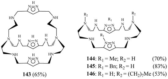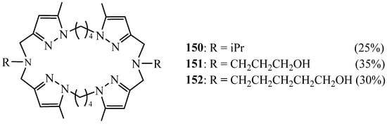 Radi et al. [70,71] used the same strategy performed by Malek et al. [64] to synthesise two tetrapyrazolic macrocycles 153 and 154 with different cavity sizes and bear one lateral arm (Figure 42). This was performed by [1+1] cyclisation of a chlorinated derivative with 3 aminopropan-1-ol to obtain the macrocycle 154, and the 1,2 dibromoethane with a tetrapod ligand to obtain the macrocycle 153. These macrocycles were also found to have a complexing affinity towards both alkali and heavy metal cations.
