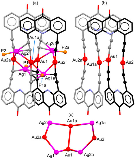 As a class of mechanically sensitive compounds, a number of d10 metal complexes [11,12,13,14,15,16,17,18,19,20,21,22,23] have been found to show remarkable luminescent mechanochromism due to mostly the formation or disruption of d10-d10 intermetallic interactions under the stimulus of mechanical actions such as crushing, grinding, stretching. Over the years, we have been devoted to the design of d8-d10 and d10-d10 heterometallic cluster complexes as phosphorescent materials for the use in solution-processed organic light-emitting diodes (OLEDs), taking advantage of aromatic acetylides as bridging ligands [24]. Recently, we are particularly interested in using rigid bis(acetylide) ligands for the preparation of a series of highly phosphorescent d10 metal cluster complexes [25,26]. In this work, we report the preparation, structure, photophysical property, and remarkable luminescent mechanochromism of two heteroctanuclear Au4Ag4 cluster complexes of 4,5-diethynylacridin-9-one (H2L).