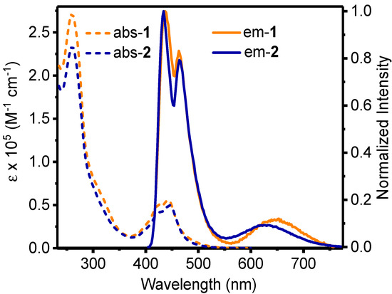 Crystals suitable for X-ray crystallographic measurement were grown by vapor diffusing diethyl ether to a DMAc solution of complex 1 or 2. The X-ray single-crystal diffraction data were collected on a Bruker D8 Venture diffractometer using IμS 3.0 microfocus source Mo-Kα radiation (λ = 0.71073 Å) and PHOTON II CPAD detector. Frames were integrated with the Bruker SAINT software package (V8.38A) using a SAINT algorithm. Data were corrected for absorption effects using the multi-scan method (SADABS) [30]. The structure was solved and refined using the Bruker SHELXTL Software Package, a computer program for automatic solution of crystal structures, and refined by the full-matrix least-squares method with ShelXle Version 4.8.6, a Qt graphical user interface for the SHELXL [31]. All non-hydrogen atoms were refined anisotropically, whereas the hydrogen atoms were generated geometrically and refined using isotropic thermal parameters. CCDC 2155149-2155150 contains the supplementary crystallographic data for this paper. These data can be obtained free of charge from the Cambridge Crystallographic Data Centre via www.ccdc.cam.ac.uk/data_request/cif (accessed on 28 February 2022).