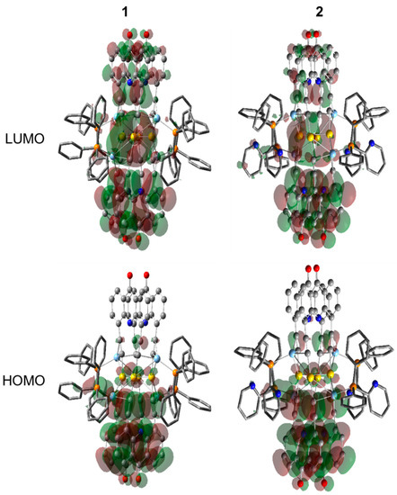 Plots of the HOMO and LUMO in triplet state (isovalue = 0.012) for Au4Ag4 Cluster Complexes 1 and 2 by TD-DFT method at the PBE1PBE-GD3 level.