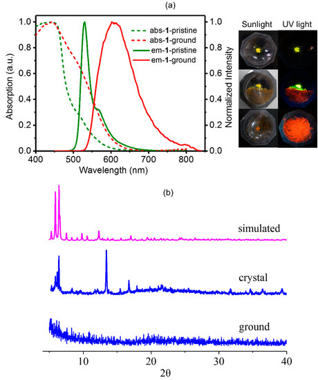 Smart luminescent materials that respond to mechanical forces show promising applications in fields such as memories, displays, sensors, and probes [1,2]. The luminescent change triggered by mechanical force is usually called luminescent mechanochromism. Various types of organic [3,4,5] and metal–organic [6,7,8] compounds have been found to show dramatic luminescent changes in emission color or intensity in response to mechanical forces such as shearing, crushing, grinding, stretching, and hydrostatic pressure. The changes in emission color or intensity under mechanical force are always reversible because the original states can be restored by solvent fuming and thermal annealing. In most cases, upon exerting a mechanical force, molecular stacking patterns undergo significant variations so that the changes in intermolecular interactions result in an alternation of photophysical properties. In fewer cases, luminescent mechanochromism arises from intramolecular contraction, deformation, or conformation variation under the action of mechanical force [3,4,9,10].