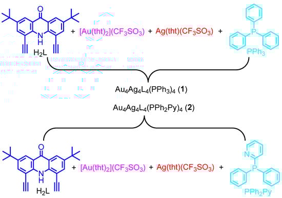 As shown in Scheme 1, complexes 1 and 2 were prepared by the reactions of [Au(tht)2](CF3SO3), Ag(tht)(CF3SO3), H2L, and PPh3 or PPh2Py (2-(diphenylphosphino)pyridine) in the presence of trimethylamine in 50% and 54% yields, respectively. Diffusion of Et2O vapor to dimethylacetamide solutions gave Au4Ag4 cluster complexes 1 and 2 as yellow crystals. They are characterized by high-resolution mass spectrometry (HRMS), 1H and 31P NMR spectroscopy, and X-ray crystallography. In the HRMS of neutral Au4Ag4 cluster complexes 1 (Supplementary Materials, Figure S1) and 2 (Figure S2), the dianionic fragment [Au4Ag2L4]2− was, respectively, observed as a base peak for both compounds, although molecular ion peak Au4Ag4(PPh3)4L4 or Au4Ag4(PPh2Py)4L4 was not found. The observation of dianionic fragment [Au4Ag2L4]2− with high abundance suggests that Au4L4 framework with a paper clip structure generated through gold(I)-bis(acetylide) coordination is sufficiently stable in ionization state. The 1H and 31 P NMR spectra (Figures S3–S6) indicate that Au4Ag4 cluster structures keep integrity in CD2Cl2 or DMSO-d6 solutions.