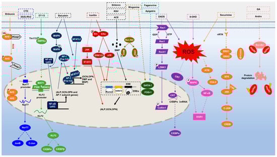 Flavonoids are mainly derived from vegetables and herbs, which are widely found in nature and have a very rich pharmacological activity. Recent studies have shown that both natural and synthetic flavonoids show significant antitumor activity and are chemically similar to estrogens, and some have been used as alternatives to estrogens []. In addition to playing an important role in the reproductive system, estrogens also play an important role in bone metabolism. The osteoprotective effects of estrogens are mainly attributed to their inhibition of bone resorption and stimulation of bone formation. Quercetin is one of the main flavonoids. Some recent studies have shown that quercetin promotes osteoblast differentiation [,,,]. Moreover, several flavonoids, including icaritin [,,,,], genistein [,,,] and kaempferol [,,], have been shown to promote osteogenic differentiation by regulating the expression of Runx2 and BMP-2 differentiation through their estrogenic effects. For example, ugonin K is a flavonoid isolated from helminthochys zeylanica (L.) that induces osteoblast differentiation through activation of the non-classical SRC signaling pathway and the estrogen receptor-dependent classical pathway. It also efficiently induces cell differentiation and mineralization in MC3T3-E1 mouse osteoblasts [,]. In addition, TGF-β1 has targeted induction of osteogenic differentiation, which may represent a novel treatment strategy for osteosarcoma with fewer side effects. Galangin, a natural flavonoid product, inhibits human osteosarcoma cell growth by inducing transforming growth factor-β1-dependent osteogenic differentiation [,,]. Similarly, the flavonoid hyperoxides inhibit the proliferation of osteosarcoma cells by inducing G0/G1, and the TGF-β signal pathway stimulates its osteogenic differentiation [,,]. Coleusin factor is a diterpenoid isolated from the roots of the tropical plant Coleus forskohlii. It can inhibit the growth of osteosarcoma by inducing bone morphogenetic protein-2 (BMP-2)-dependent differentiation []. The hormonally active form of vitamin D, 1,25-dihydroxyvitamin D3 (VD3), also has potent antiproliferative, proapoptotic and prodifferentiation effects in many malignancies. VD3 and its analogs, such as osteosarcoma cell lines MG-63 and SaOS2, also promote osteoblast differentiation. P73 is essential for VD3-mediated osteosarcoma differentiation, and induction of p73 in response to DNA damage enhances VD3-mediated osteosarcoma cell line differentiation [,,,,,].