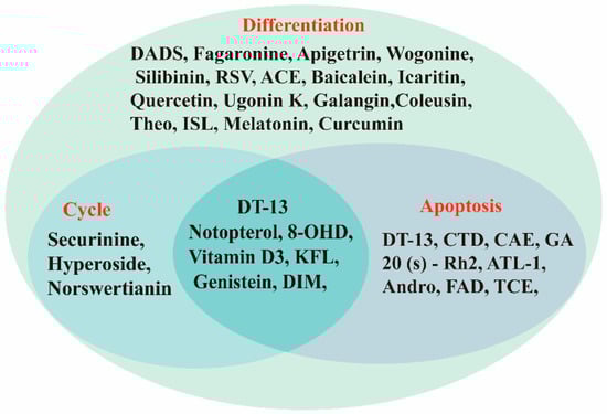Cancer is one of the major diseases threatening human health in the 21st century. Statistical studies have shown that 19.3 million new cancer patients were diagnosed, and 10 million died from cancer in 2020. If the national incidence rate stays the same, there will be 28.4 million cancer patients worldwide in 2040—47% higher than in 2020 []. A tumor is a new organism formed by local tissue and cell proliferation under the action of various tumorigenic factors. Because the new organism mostly presents space-occupying massive processes, tumors are also known as vegetation. In addition to uncontrolled cell proliferation and survival, the continuous loss of normal differentiation is also a feature of most malignant cells []. Malignant tumors include carcinoma, sarcoma, hematopoietic and lymphoid malignancies, etc. The conventional treatments of tumors include surgery, radiotherapy, chemotherapy, targeted therapy, immunotherapy, traditional Chinese medicine therapy, etc., which are aimed at killing tumor cells. However, killing tumor cells inevitably damages normal cells, and tumor cells cannot be eliminated due to their migratory and invasive nature. Tumor differentiation is a method aimed at reactivating the endogenous differentiation program of cancer cells and inducing cancer cells to stop proliferation and restore normal cell characteristics []. The molecular mechanisms involved in the differentiation process are potential therapeutic targets for tumor cells, and the induction of differentiation is an ideal outcome for both chemopreventive and therapeutic agents.