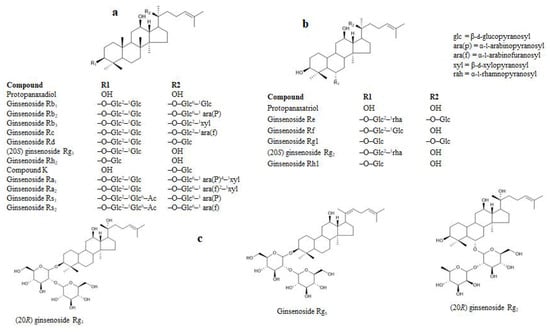 Structure of selected ginsenosides. (a) PPDs. (b) PPTs. (c) Derivatives of PPDs and PPTs. Glc, β-d-glucopyranosyl; ara(P), α-l-arabinopyranosyl; ara(f), α-l-arabinofuranosyl; Xyl, β-dxylopyranosyl; rah, α-l-rhamnopyranosyl.