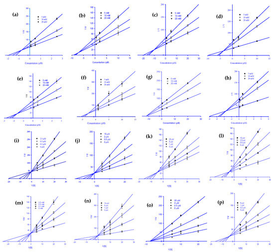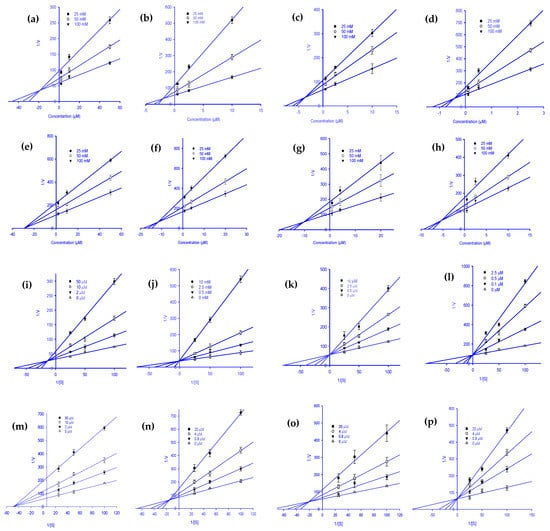 Dixon plots for HRAR inhibition by various ginsenoside derivatives. Protopanaxadiol (a), (20S) ginsenoside Rg3 (b), (20R) ginsenoside Rg3 (c), ginsenoside Rh2 (d), compound K (e), protopanaxatriol (f), (20R) ginsenoside Rg2 (g), and ginsenoside Rh1 (h) were tested in the presence of 5 mM (●), 10 mM (○), and 20 mM (▼) substrate (DL-glyceraldehyde). Lineweaver–Burk plots for HRAR inhibition were analyzed in the presence of the following ginsenoside concentrations: 0 µM (Δ), 0.1 µM (▼), 0.5 µM (○), and 2.5 µM (●) for protopanaxadiol (i); 0 µM (Δ), 0.5 µM (▼), 2 µM (○), and 10 µM (●) for (20S) ginsenoside Rg3 (j); 0 µM (Δ), 1 µM (▼), 5 µM (○), and 20 µM (●) for (20R) ginsenoside Rg3 (k); 0 µM (Δ), 0.5 µM (▼), 2.5 µM (○), and 10 µM (●) for ginsenoside Rh2 (l); 0 µM (Δ), 0.1 µM (▼), 0.5 µM (○), and 2.5 µM (●) for compound K (m); 0 µM (Δ), 1 µM (▼), 5 µM (○), and 10 µM (●) for protopanaxatriol (n); 0 µM (Δ), 0.5 µM (▼), 4 µM (○), and 20 µM (●) for (20R) ginsenoside Rg2 (o); 0 µM (Δ), 0.2 µM (▼), 1 µM (○); and 5 µM (●) for ginsenoside Rh1 (p).