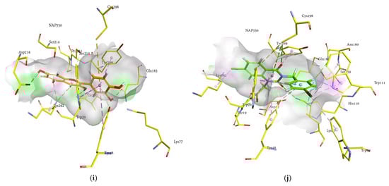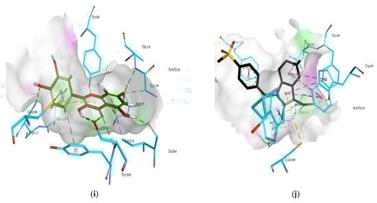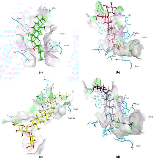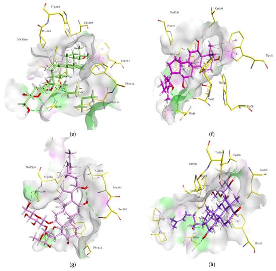 The 3D interaction in Figure 5a–j revealed the binding of ginsenosides with the hydrophilic cavity with multiple H-bonding, alkyl linkages, π-alkyl interactions, and π-π stacking near the NAP350. As shown in the figures, the ginsenosides adopted the conformations at the entrance site, active pocket, and catalytic cleft of 1IEI well by exhibiting multiple bonds of several types attributable to many hydroxyl groups (H-bonding), the main hexadecahydrocyclopenta[α]phenanthrene nucleus (π-π T-shaped, π-alkyl and π-π stacked interactions), and the alkene chain (alkyl linkages). Therefore, the binding of ginsenosides within the aldose reductase (1IEI) was stabilized by the presence of several types of interactions and demonstrated 3D-binding interactions similar to those zenarestat exhibited. In addition to strong hydrogen bonds, some of the ginsenosides exhibited hydrophobic interactions, as shown in the 2D interaction diagrams (Figure S2, Supplementary Materials).