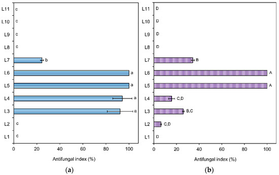 Antifungal activities of 11 fractions from leaf essential oil against wood-rotting fungi at a concentration of 200 μg/mL. (a) L. sulphureus; (b) L. betulina. Different letters (a–c; A–D) in the Figure are statistically different at p < 0.05 according to the Scheffe test.