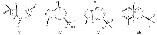 Chemical structures of sesquiterpenoids isolated from leaf essential oil. (a) 4,5-Epoxy-β-caryophyllene; (b) Guaiol; (c) Bulnesol; (d) β-Elemol.
