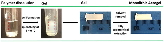 All gel samples were prepared in hermetically sealed test tubes by heating the mixtures at a temperature close to the solvent boiling point until complete polymer dissolution. Once the gel was obtained, the solvent was extracted with supercritical CO2. Monolithic cylindrical aerogels were thus obtained with the same dimensions of the starting gels.