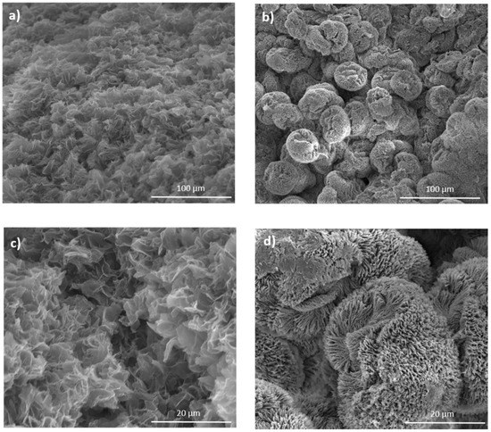 The SEM micrographs of the PLLA/BzOMe and PLLA/CPO aerogels show different morphologies depending on the solvent used to prepare the native gel. In detail, the PLLA/CPO aerogels (Figure 3a,c) have a structure consisting of the homogeneously distributed interconnected nanosheets. On the contrary, the SEM images of the PLLA/BzOMe aerogels (Figure 3b,d) have a non-homogeneous structure consisting of spheroids of about a 30-micron radius, in turn composed of polymer nanosheets.