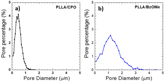 SPIP™ image analysis of SEM micrographs in Figure 3c,d: percentage of pores (assumed spherical) as a function of diameter: (a) PLLA/CPO aerogel and (b) PLLA/BzOMe aerogel.