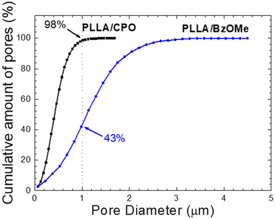 The macropore size distribution, evaluated as the percentage of pores (assumed spherical) detected on the analyzed surface for both SEM micrographs of Figure 3c,d, is reported in Figure 4a,b. A clear difference in size distribution for the PLLA/CPO and PLLA/BzOMe aerogels can be seen in the graphs. In detail, a larger distribution of the macropore size is present in the PLLA/BzOMe, while macropores of a small size (< 1 micron) are prevalent in PLLA/CPO. As shown in Figure 4a,b, the most frequent pore size is lower for PLLA/CPO (0.46 µm) than for PLLA/BzOMe (1.14 µm). The cumulative amount of pores vs. pore size (assumed to be spherical) is instead reported in Figure 5. The SPIPTM analysis shows that 98% of the macropores in the PLLA/CPO aerogel have a diameter of less than 1 micron, while in the PLLA/BzOMe aerogel, only 43% of macropores fall into this category.