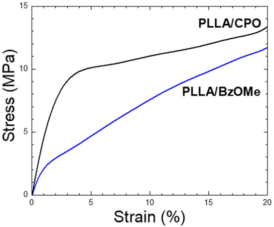 The compressive strength of the PLLA/CPO and PLLA/BzOMe aerogels was analyzed. The stress–strain curves (for compressive stresses) of the two aerogels are shown in Figure 6. Young’s compression modulus, calculated from the slope of the initial part of the stress–strain curve, appears to be very different in the two samples. In detail, the PLLA/CPO aerogel has an elastic modulus that is almost double compared to the PLLA/BzOMe sample; 5.5 MPa and 2.6 MPa, respectively. Moreover, the toughness of the PLLA/CPO aerogel is greater than the PLLA/BzOMe one, as well as the yield point for the sample PLLA/CPO, which is at higher stress and strain values than those of PLLA/BzOMe.