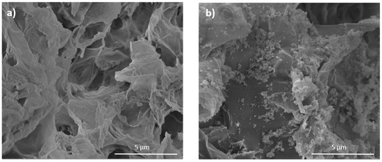 SEM images of PDA-coated and uncoated PLLA/CPO aerogels are compared in Figure 8. The aerogel interconnected nanosheet structure, before coating, is shown in Figure 8a. In the coated sample, Figure 8b, a granular deposit of PDA onto the aerogel nanosheets is clearly detectable.
