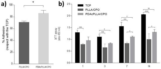 In vitro evaluation of PLLA/CPO and PDA-coated PLLA/CPO aerogels. (a) Cell adhesion after 24 h. Results show the percentage of adhesion with respect to the control (TCP). (b) Cell proliferation after 1, 3, 7, 14 days. (* p < 0.05; ** p < 0.01; *** p < 0.001; **** p < 0.0001).