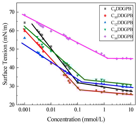 Generally, according to Rosen’s theory [21], surface tension plots with time can be divided into four regions: induction, rapid decline, medium equilibrium, and equilibrium. As shown in Figure 3, the induction and rapid decline regions were detected for CnDDGPB. At low solution concentrations, the surface tension did not reach the minimum value in equilibrium within the effective detection range; however, this value was reached at high solution concentrations. Therefore, in a certain range, the increase in the concentration of CnDDGPB surfactant solution facilitates the reduction of the surface tension of the solution.