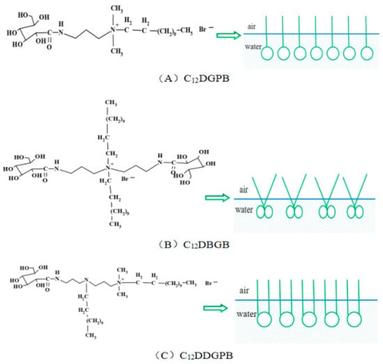 Generally, the minimum molecular area of conventional surfactants with small hydrophilic head groups depends on the length and cross-sectional area of the hydrophobic chains [17]. Compared with the single-chain glucosamine quaternary ammonium salt surfactants CnDGPB and stellate glucosamine quaternary ammonium surfactants CnDBGB, the Γmax value followed the order CnDGPB > CnDDGPB > CnDBGB, and the Amin value increased in the order CnDGPB < CnDDGPB < CnDBGB (the molecular interface arrangement of CnDGPB, CnDDGPB, and CnDBGB is shown in Figure 2). This is most likely because the single-chain surfactant molecules have a hydrophobic carbon chain, small volume, linear parallel arrangement at the water/oil interface, and dense molecular arrangement [18], and Γmax increases with the hydrophobic chain length. Moreover, when the size of the hydrophobic group changes while that of the hydrophilic group remains unchanged, the value of Amin changes. The double-chain surfactants CnDDGPB with two hydrophobic carbon chains exhibit a structure similar to that of the Gemini surfactant. In the complex molecular structure, the repulsion force between the two carbon chains increases, and a single molecule occupies the minimum surface area at the interface, which is larger than that of a single-chain surfactant, resulting in a smaller saturated adsorption capacity (Amin) than that of the latter. Stellate surfactant CnDBGB has two hydrophobic carbon chains and two hydrophilic groups centered on the N atom, forming a nearly spherical structure with large steric hindrance. This causes a large repulsion between the hydrophobic group and water and a small number of stellate surfactant molecules on the interface, resulting in a large effective area of each molecule.