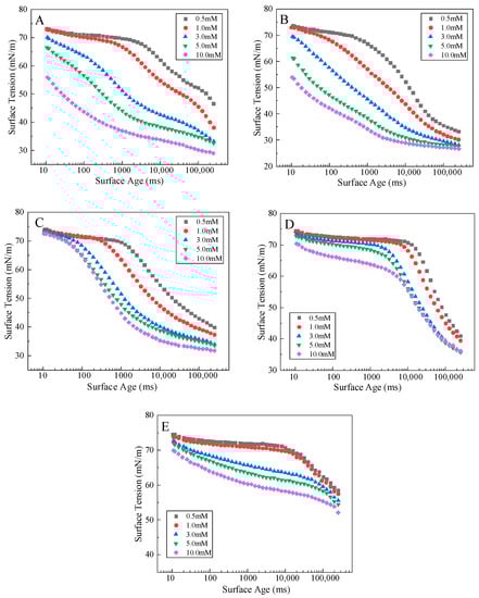 Relationship between the dynamic surface tension of (A) C8DDGPB, (B) C10DDGPB, (C) C12DDGPB, (D) C14DDGPB, and (E) C16DDGPB surfactant aqueous solutions and time.