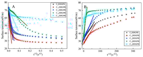 Relationship of the dynamic surface tension of a CnDDGPB surfactant aqueous solution with time (A) t1/2, (B) t−1/2. (The concentration of the surfactant solution was 5 mmol/L).
