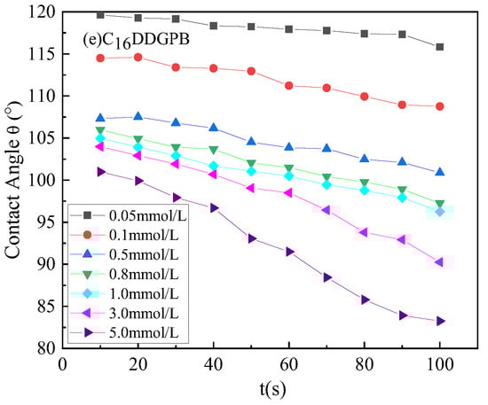 Effect of the surfactant concentration on the contact angle of a PTFE surface for (a) C8DDGPB, (b) C10DDGPB, (c) C12DDGPB (d) C14DDGPB, and (e) C16DDGPB.