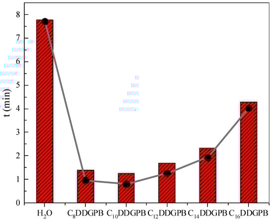 The wettability of CnDDGPB with different carbon chain lengths to canvas was measured, and the results are shown in Figure 7. The wettability of sugar-based surfactants is closely related to the length of their hydrophobic and hydrophilic groups. Thus, the best wettability is achieved when the ratio of the size of the hydrophilic group and the length of the hydrophobic group is appropriate, and wettability is reduced as the length of hydrophilic or hydrophobic groups increases [31]. As can be deduced from Figure 7, C10DDGPB had the shortest wetting time and C16DDGPB had the longest wetting time. Taken together, the results of the change in contact angle and wettability experiments demonstrate that C10DDGPB had the best wettability among the samples evaluated.