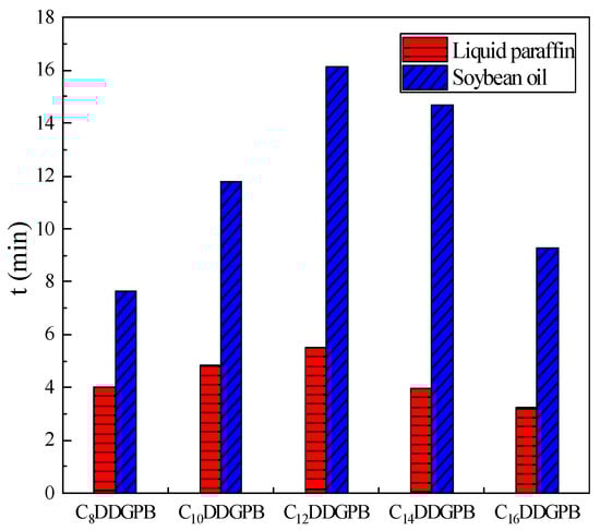 The emulsifying ability is one of the most important parameters for evaluating the performance of surfactants [32,33]. To evaluate the emulsifying effect of the CnDDGPB surfactants on an edible oil and a mineral oil, soybean oil and liquid paraffin were selected. Soybean oil is a typical vegetable oil, and liquid paraffin is, together with kerosene, gasoline, and diesel, a representative example of mineral oils, which are a mixture of refined liquid hydrocarbons obtained from petroleum. The ability of the sample solution to emulsify soybean oil and liquid paraffin was determined using the cylinder method, which consists of recording the time required to separate 10 mL water from different emulsions. Longer times are indicative of better emulsifying properties. The results are shown in Figure 8.