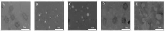 TEM of CnDDGPB at 5.0 mmol/L:(A) C8DDGPB, (B) C10DDGPB, (C) C12DDGPB, (D) C14DDGPB, (E) C16DDGPB.