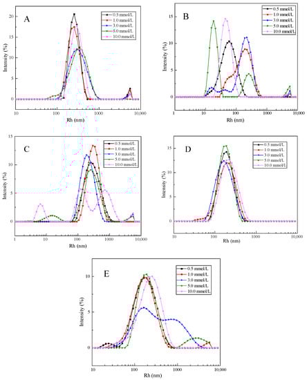 Particle size distribution of (A) C8DDGPB, (B) C10DDGPB, (C) C12DDGPB, (D) C14DDGPB, and (E) C16DDGPB.