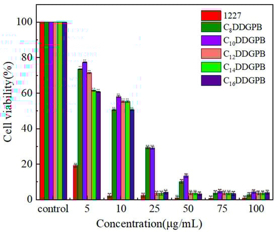 As can be seen in Figure 12, cell survival rate decreased with an increase in carbon chain length at the same concentration. C10DDGPB exhibited the lowest toxicity. Dodecyldimethylbenzyl ammonium chloride (1227) is a commonly used and efficient broad-spectrum cationic surfactant. A comparison of the toxicity results of 1227 and CnDDGPB (Figure 12) revealed that the cell survival rate of CnDDGPB was much higher than that of 1227, which suggests that the double-chain glucosamine quaternary ammonium salt is safer than this conventional disinfectant in terms of disinfection and sterilization. The IC50 values of 1227, C8DDGPB, C10DDGPB, C12DDGPB, C14DDGPB and C16 DDGPB are 3.31 μg/mL, 10.75 μg/mL, 13.65 μg/mL, 9.07 μg/mL, 8.36 μg/mL and 9.15 μg/mL, respectively. The CMC values of C8DDGPB, C10DDGPB, C12DDGPB, C14DDGPB and C16 DDGPB are 48.68 μg/mL, 60.18 μg/mL, 76.39 μg/mL, 109.24 μg/mL, and 752.59 μg/mL, respectively. This indicates that the IC50 value of this kind of quaternary ammonium salt is below the CMC value.
