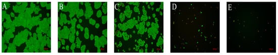 Live/dead staining (100×) when C12DDGPB and HeLa cells were cocultured for 48 h. (A) Control, (B) 5 μg/mL, (C) 10 μg/mL, (D) 25 μg/mL, (E) 50 μg/mL. (Note: HeLa cells normally grow in the form of agglomeration).
