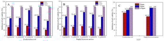 Inhibitory effect of surfactants on bacteria. (A) Escherichia coli, (B) Staphylococcus aureus, (C) 1227.