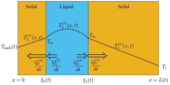 where , and is the density, specific heat capacity and thermal conductivity of phase i, with for liquid (solid). The one-front dynamics problem is defined through Equations (2)–(4), with the corresponding boundary conditions, given by Equation (1).