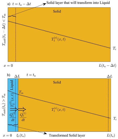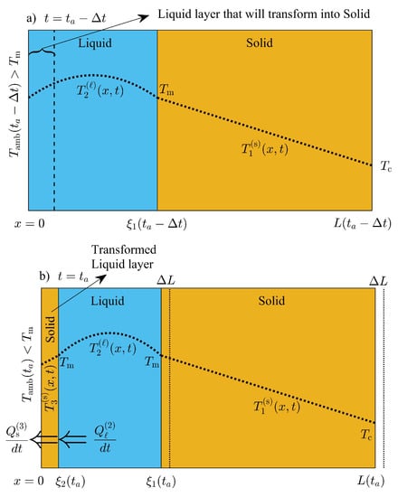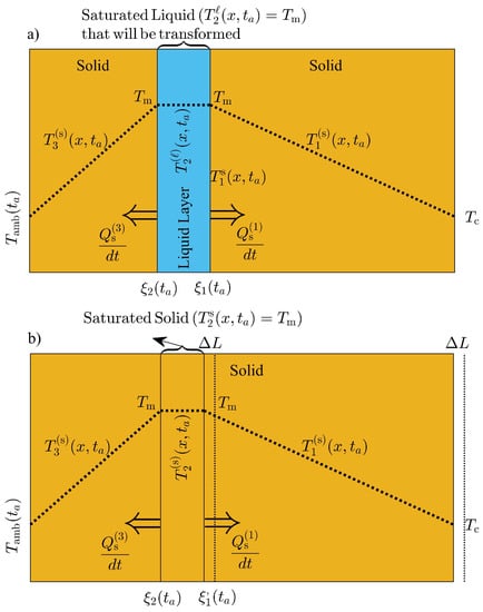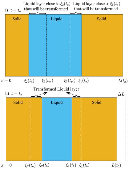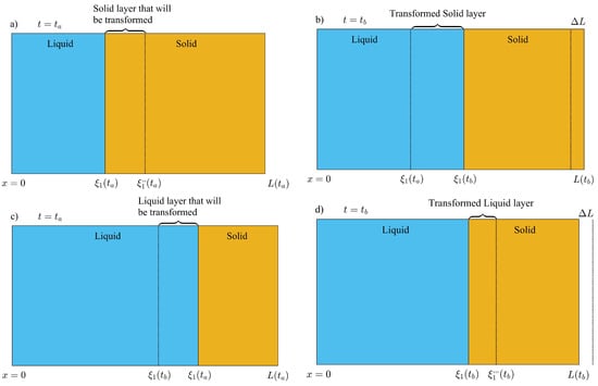 The total thickness in the liquid layer that will be transformed into solid during the time interval is shown in Figure 6a. The temperature of the liquid mass that belongs to the regions in direct contact with and shown in Figure 6a will change from an initial value at to the melting temperature , just before the phase transition at some time , between and . The total thickness of this fraction of liquid is: , where and . Mass conservation can be applied to the fraction of liquid close to as follows: