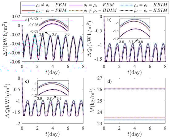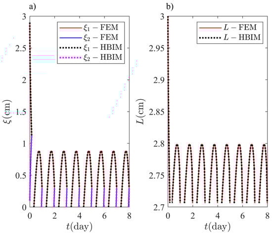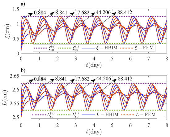 The model described through Equations (4), (13), (16), and (18) will be solved with the FEM and HBIM discussed in the previous section. The model is equivalent to Equations (4), (16), (18), and (22), where Equation (22) results from applying total mass conservation to Equation (13). Figure 10 shows the FEM and HBIM solutions for , , and in a Octadecane layer with an initial thickness of . Initially, the system is almost in its liquid phase, with a thin solid layer of thickness close to the exterior surface. Additionally, a solid layer of of thickness lies close to the interior surface. The system is close to a steady periodic regime after being exposed to the ambient temperature for 4–5 days.