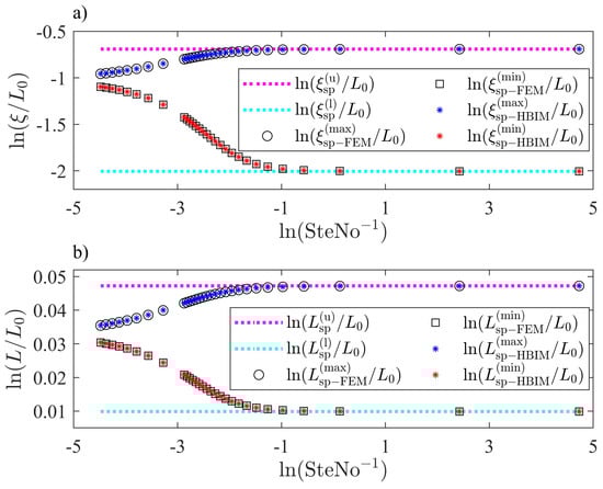 Homogeneous isothermal boundary conditions have been applied to the one-front dynamics problem where, on the one hand, the temperature at is constant and higher than . On the other hand, the temperature at is constant and below . Steady state solutions for the thickness and liquid-solid interface position have been found when the system is subjected to this type of boundary conditions [14]. Periodic boundary conditions are applied at , which emulate the ambient temperature on the exterior surface of the PCM layer. The steady state values found in Ref. [14] can be applied to define upper and lower bounds to the interface position and layer thickness when the system is subjected to the boundary conditions shown in Equation (1). According to the steady state values for the liquid–solid interface position found in Ref. [14], an upper and lower bound for when the system is in the steady periodic regime and subjected to the boundary conditions given by Equation (1) are given by: