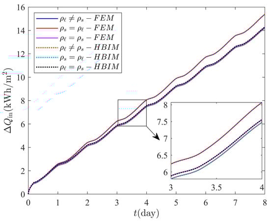 Energy transferred to the interior of the room according to the numerical and semi-analytical solutions used in this work. Constant volume methods of Refs. [21,23,24,25] are compared with the result obtained through the proposed model in this work. According to the initial state of the system and the result shown in this figure, the thermal performance of the PCM layer is enhanced by assuming equal densities.