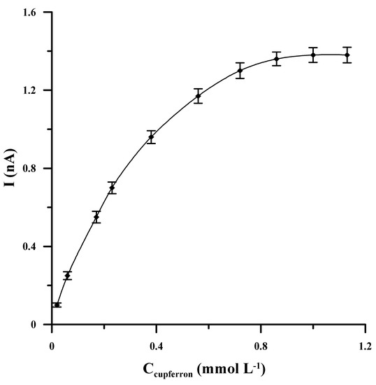 The basis of the proposed procedure is the adsorptive preconcentration of vanadium in the form of a complex with cupferron. Therefore, without the addition of cupferron, no stripping peak was obtained by recording the voltammogram from 0.1-mol L−1 acetate buffer (pH = 4.6) containing 1 × 10−8-mol L−1 V(V) without the addition of cupferron. It was observed that the lowest concentration of the complexing agent at which the vanadium peak appeared was 2 × 10−5 mol L−1, while a further increase in the cupferron concentration to 1 × 10−3 mol L−1 led to an enhancement in the voltammetric response of vanadium. However, when the concentration of cupferron in the analyzed solution was higher than 1 × 10−3 mol L−1, no further changes in the height of the vanadium peak were observed (Figure 2), so the concentration of 1 × 10−3 mol L−1 was chosen as the most favorable in the vanadium determination.