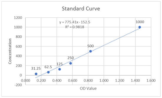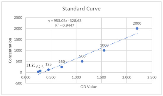 Then, the standard working solution was prepared. The standard was centrifuged at 10,000× g for 1 min, and 1.0 mL of reference standard and sample diluent was added to it. It was left standing for 10 min, turning it upside down several times during this period. After it dissolved fully, it was mixed thoroughly again with a pipette. This reconstitution produced a working solution of 2000 pg/mL. Serial dilutions are made from this working solution.