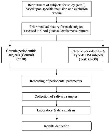 The sampling method used for this study was the probability, clustered sampling method. A total of 60 patients were recruited, divided equally among the control and the test group. The control group consisted of patients diagnosed with chronic periodontitis only (and no systemic diseases), whereas the test group constituted patients diagnosed with both type-II DM and chronic periodontitis. The participants were distributed into test and control groups after assessing the medical history and measuring the random blood glucose levels (for control group) or checking their HbA1c levels (for test group). Those with HbA1c ≥ 6.5% were selected only, as they are proven diabetics.