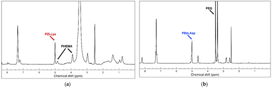 1H NMR (600 MHz) spectra in DMSO-d6 of (a) protected polycationic hybrid diblock copolymer PHEMA-b-PZLLys; (b) protected polyanionic hybrid diblock copolymer HO-PEG-b-PBzLAsp.
