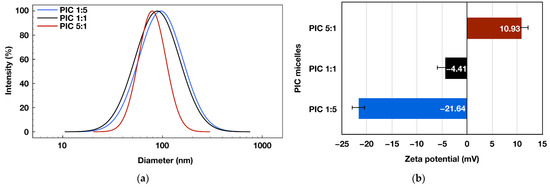 Another important parameter determining the potential application of the formed PIC micelles as drug nanocarriers is their average diameter. Thus, DLS measurements were performed on PIC micelles’ aqueous dispersions. As a result, the presence of nanosized objects was detected for all three formulations, with average diameters between 79 and 96 nm (Figure 3a). The average particles’ diameters decreased gradually with increasing the molar content of the positively charged PHEMA-b-PLLys copolymer into the PIC micelles. Thus, the PIC micelles prepared at [PLLys]/[PLAsp] = 5:1 exhibited the most compact structure with an average size of 79 nm and the narrowest size distribution (Table 2).