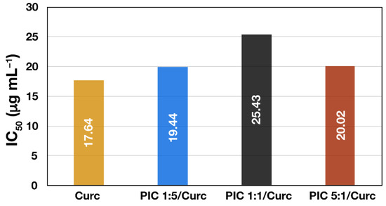 Finally, the effect of Curc encapsulation into different types of PIC micelles on its antioxidant activity was evaluated. In addition to the drug’s improved aqueous dispersibility and stability, it is important to show that the incorporation of Curc into the nanocarrier does not negatively affect its biological properties. The DPPH• scavenging activities of Curc-loaded PIC micelles and free curcumin solubilized in ethanol/water mixture expressed as IC50 (μg mL−1) are shown on Figure 6. A high free radical scavenging activity results in low IC50 value, indicating that a lower concentration of the particular substance is required to reduce the activity of the probe by 50%. Thus, Curc solubilized in ethanol/water exhibited the best scavenging activity (IC50 = 17.64 μg mL−1) followed by curcumin encapsulated in surface-charged PIC micelles showing slightly lower but still similar scavenging activity—IC50 = 19.44 μg mL−1 and IC50 = 20.02 μg mL−1 for PIC 1:5/Curc and PIC 5:1/Curc micelles, respectively. The lowest DPPH• scavenging activity is demonstrated by PIC 1:1/Curc micelles (IC50 = 25.43 μg mL−1). However, all three IC50 values are close to that of the free drug, indicating that the antioxidant activity of the encapsulated Curc is preserved. Moreover, in aqueous media or in the blood stream where the free hydrophobic drug is practically insoluble and subjected to elimination and degradation, the curcumin-loaded PIC micelles are expected to reveal their superior antioxidant activity. The DPPH• scavenging activities of the corresponding empty PIC micelles were also evaluated. The results show weak and independent on concentration activity for all three types of empty PIC micelles. As a result, IC50 values of the empty micelles could not be determined. Thus, it might be concluded that the antioxidant activity of the Curc-loaded PIC micelles is mainly due to the curcumin itself, rather than the nanocarrier.