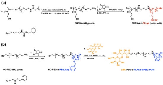 Synthetic routes toward: (a) positively charged PHEMA-b-PLLys and (b) negatively charged LBA-PEG-b-PLAsp peptide-based hybrid diblock copolymers.