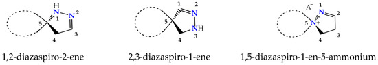 Spiropyrazolines, also termed as spirocyclic hydrazine moiety, are rigid asymmetric heterocyclic structures with a chirality axis and with possible centers of chirality C-5 carbon atoms in the most studied 1,2-diazospiro- and 2,3-diazospiropyrazolines or the ammonium nitrogen atom N(+)-5 in 1,5-diazospiropyrazolinium systems (Figure 1).Thus, these compounds exhibit great synthetic potential due to an enantiomeric advantage, regioisomeric composition, reactivity, and tautomeric transformations. Essentially, 1,2- and 2,3-spiro-1-pyrazolines exist as spiro-2-pyrazolines (∆2 isomers) [3], although, in solutions, they exhibit an equilibrium of the imine and enamine forms [4]. As we know, the spiropyrazolinium salts with a 1,5-diazaspiro-1-en-5-ium fragment that we obtained via the hydrolysis of 3-(β-heteroamino)ethyl-5-aryl-1,2,4-oxadiazoles and the arylsulfochlorination of β-aminopropioamidoximes exist, under standard conditions, as the ∆2 isomer [5,6,7,8]. The thermodynamic advantage of possible tautomers of the key pyrazoline moiety was estimated; it turns out that, in the case of pyrazolines, the ∆2 isomer is much more stable than the others [9].