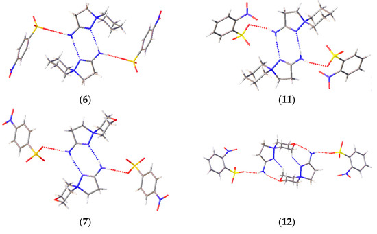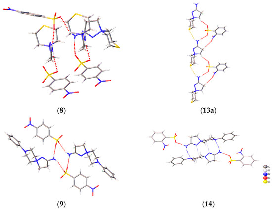 A prominent variation in the biological properties of these compounds can be accounted for the possibility of these cations to realize different conformations and to take part in different types of H bonds [34]. In these solids, the only donor for the H bonds is the amino group, while the sulfonate groups of the anions and heteroatoms of the cations compete to act as acceptors of H bonding. As a result, H-bonded chains are observed in 2-amino-1,5-diazathiospiro[4.5]-dec-1-ene-5-ammonium-containing salts and tetramers in six other salts (Figure 4). The D33(9) tetramers in 6, 7, and 11 are formed through two N–H…N interactions and two N–H…O ones. Similar D33(13) tetramers in 12 and 14 are obtained through a similar N–H…O cation…anion interactions, but the cations are shifted along each other to allow for the bonding with a heteroatom of the six-membered ring. The R44(12) cycles in 9 and the H-bonded chains in 8 and 13 are formed by the interactions of the amino group with sulfonate groups of two neighboring molecules. The Gad(n) notation of H-bonded architectures is presented in terms of [33], where G represents the type of pattern (C for chain, S for intramolecular hydrogen bonds, R for ring, and D for finite), a is the number of acceptors, d is the number of donors, and n the number of atoms in the pattern. Note that, despite the similar crystal parameters and space group of 11–13 (Table S1, ESI), these compounds cannot be regarded as isostructural, as they realize different packing and intermolecular (including H-bonding) interactions. Crystal packing demonstrates that, for these spirocations, heteroatoms of the six-membered cycle can take part in H bonding, and different conformations can be stabilized by means of intermolecular bonding.